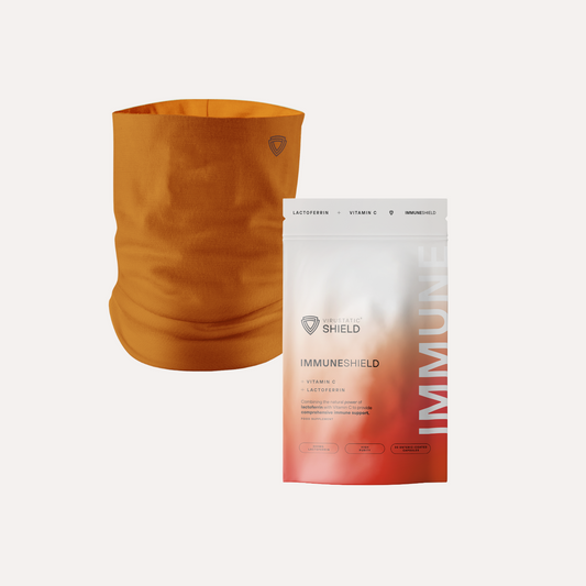 THE ERGO SHIELD® IS A GENTLY TAPERED, ERGONOMIC SNOOD-STYLE FACE COVERING DESIGNED FOR 360-DEGREE, STYLISH PROTECTION. MADE FROM INNOVATION AWARD-WINNING, PATENTED MATERIAL BY VIRUSTATIC®.